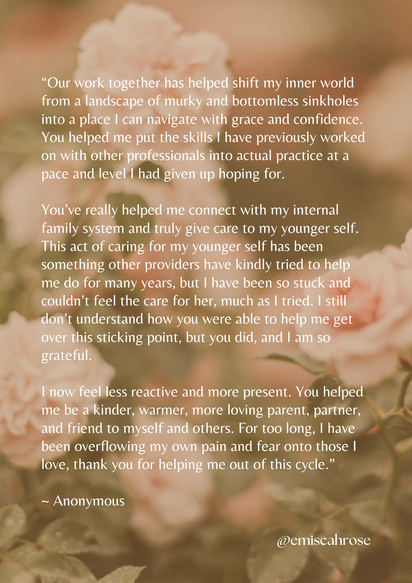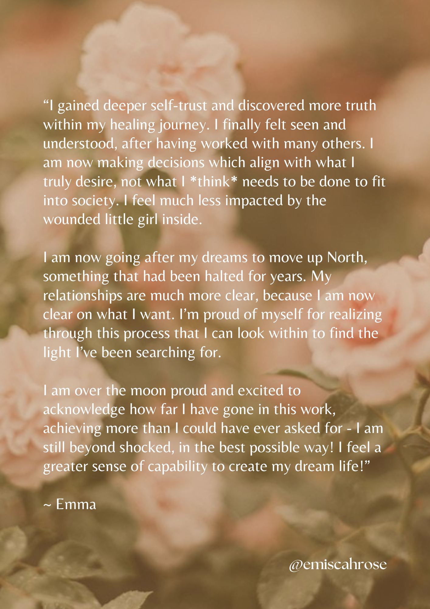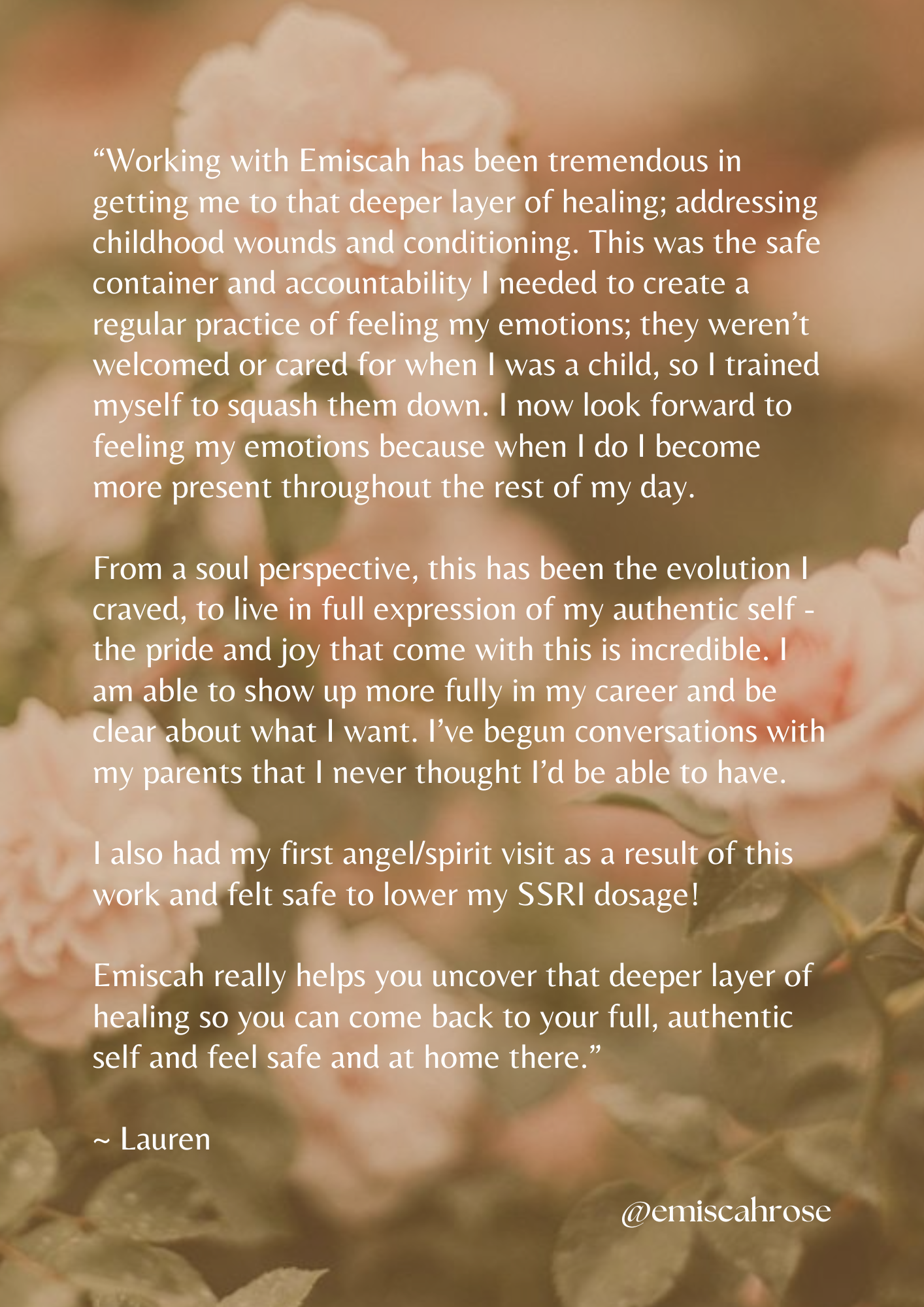 "Emiscah is an angel who holds such gentle and beautiful space for her clients. This capacity goes beyond what any other relationship in your life looks like - friend, family, partner, even a therapist, because the way she does it allows so much patience and isn't rushing to "fix it" like many others in our lives might do. She allowed me to go to a level of depth with my healing that I wasn't getting anywhere else." - Lauren